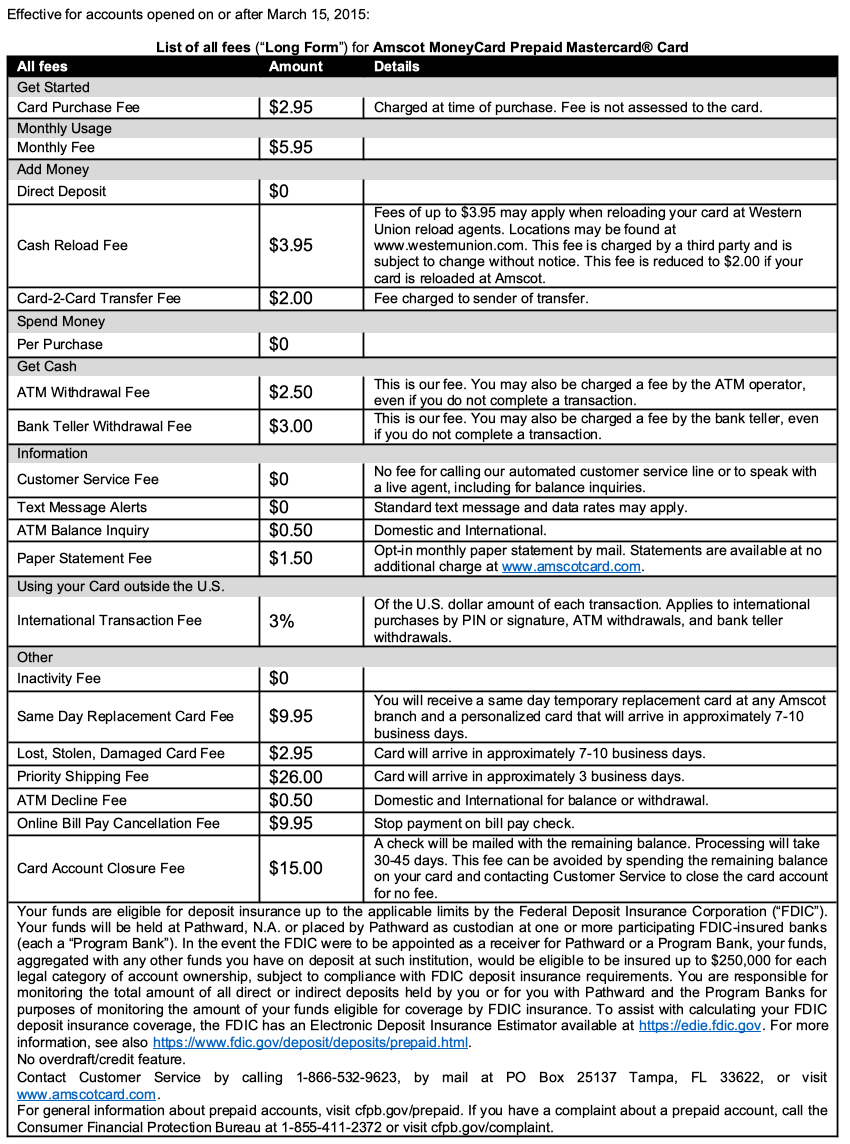 These fees apply to new Amscot MoneyCards purchased on or after March 15, 2015. The fees associated with cards purchased before this date may be different. Please login to your card account to view your cardholder agreement and fees.